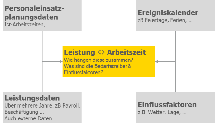 Wir bieten Software und Beratung zur fundierten Ermittlung der Bedarfstreiber und Personalbedarfsberechnung. Dazu nutzen wir vorhandene Unternehmensdaten (modern Big Data genannt) für die Personalbedarfsanalyse und setzen sie in Bezug zueinander: