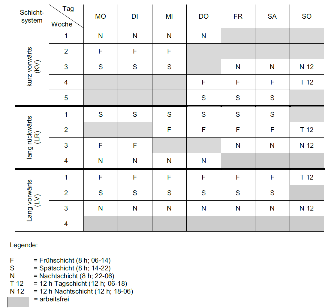 Eine aktuelle Studie unter Mitarbeit von XIMES Senior Consultant Dr. Anna Arlinghaus in Kooperation mit der GAWO e.V. (Nachreiner et al. 2019, Link zum Abstract) hat sich daher der Fragestellung gewidmet, wie Beschäftigte mit verschiedenen Schichtplänen ihre Zufriedenheit und das Sozialleben einschätzen. Dazu wurden Daten einer schriftlichen Befragung bei 249 Schichtarbeitern in vier Chemiebetrieben aus zwei Unternehmen mit kurz vorwärts, lang vorwärts und lang rückwärts rotierten Systemen (unter sonst vergleichbaren Bedingungen) analysiert. Folgende Schichtpläne wurden untersucht: